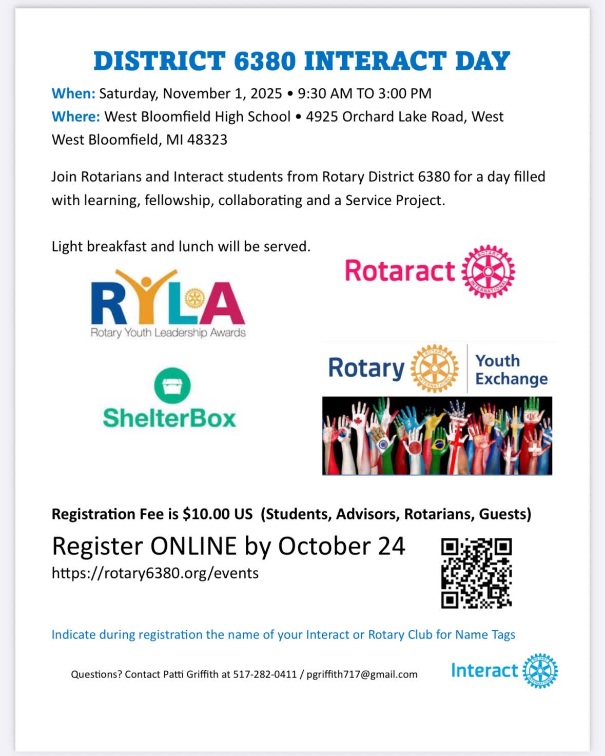 We have a great program planned for Interact Day! We will be highlighting the Rotary Programs of Youth Exchange, RYLA, Shelter Box, Rotaract, and ending Polio.